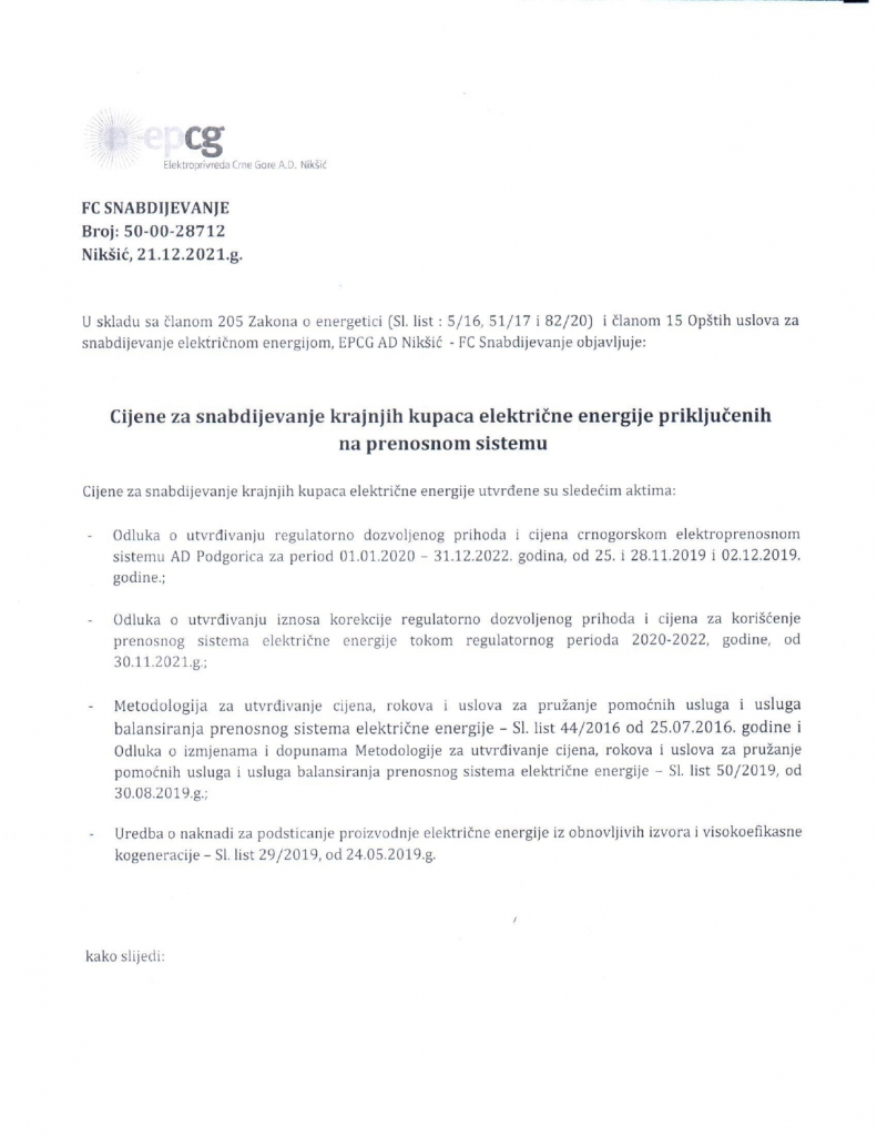 Cijene za snabdijevanje krajnjih kupaca električne energije (primjenjuju se od 01.01.2021)