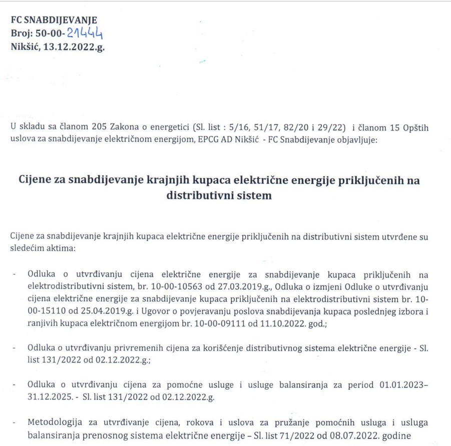 Cijene za snabdijevanje krajnjih kupaca električne energije priključenih na distributivni sistem (16. decembar 2024)