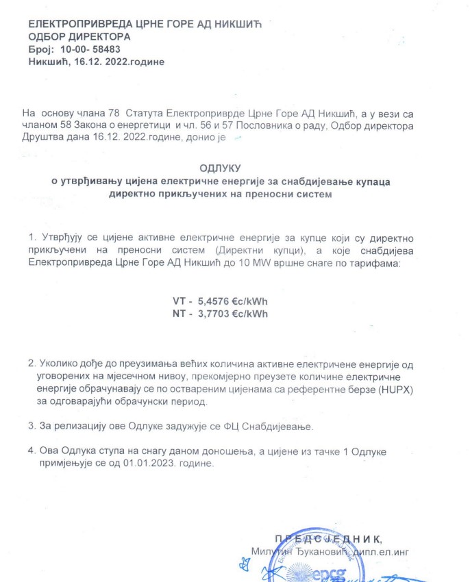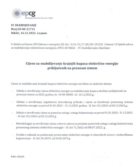 Cijene za snabdijevanje krajnjih kupaca električne energije priključenih na prenosni sistem (16. decembar 2024)
